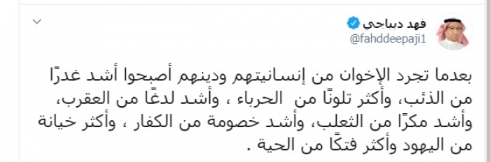 وكتب عبر تغريدة له على "تويتر" رصدها " المشهد العربي": "بعدما تجرد الإخوان من إنسانيتهم ودينهم أصبحوا أشد غدرًا من الذئب، وأكثر تلونًا من الحرباء، وأشد لدغًا من العقرب، وأشد مكرًا من الثعلب، وأشد خصومة من الكفار، وأكثر خيانة من اليهود وأكثر فتكًا من الحية".
