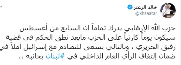 وكتب عبر تغريدة له على "تويتر" رصدها " المشهد العربي":" حزب الله الإرهابي يدرك تماماً أن السابع من أغسطس سيكون يوما كارثيا على الحزب ما بعد نطق الحكم في قضية رفيق الحريري ،وبالتالي يسعى للتصادم مع إسرائيل أملاً في ضمان التفاف الرأي العام الداخلي في لبنان بجانبه".