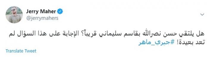 وقال في تغريدة عبر "تويتر" رصدها "المشهد العربي": "هل يلتقي حسن نصرالله بقاسم سليماني قريباً؟ الإجابة على هذا السؤال لم تعد بعيدة".