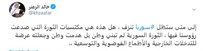 وقال في تغريدة عبر "تويتر" رصدها "المشهد العربي": "إلى متى ستظل سوريا تنزف، هل هذه هي مكتسبات الثورة التي صدعت رؤوسنا فيها، الثورة السورية لم تبني وطن بل هدمت وطن وجعلته عرضة للتدخلات الخارجية والأطماع الفوضوية والتوسعية".