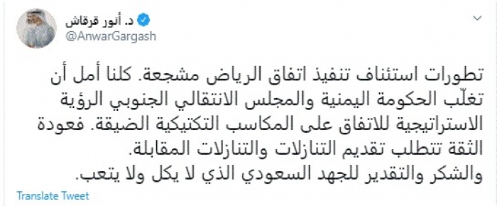وقال في تغريدة عبر "تويتر" رصدها "المشهد العربي": "تطورات استئناف تنفيذ اتفاق الرياض مشجعة".