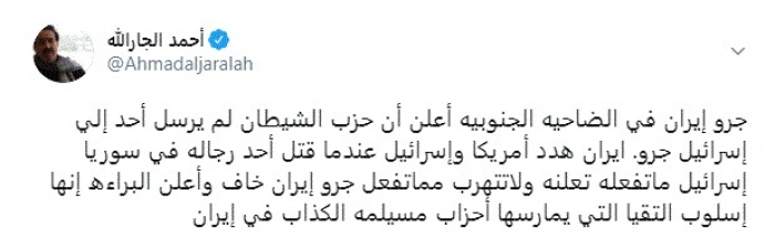 وأضاف: "إسرائيل ما تفعله تعلنه ولا تتهرب مما تفعل جرو إيران خاف وأعلن البراءة أنها أسلوب التقيا التي يمارسها أحزاب مسيلمة الكذاب في إيران".