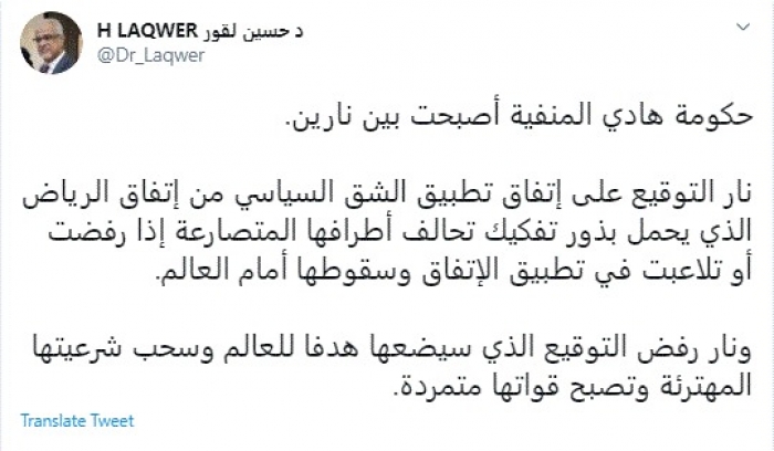 وكتب في تغريدة عبر "تويتر" رصدها "المشهد العربي": "حكومة هادي المنفية أصبحت بين نارين".