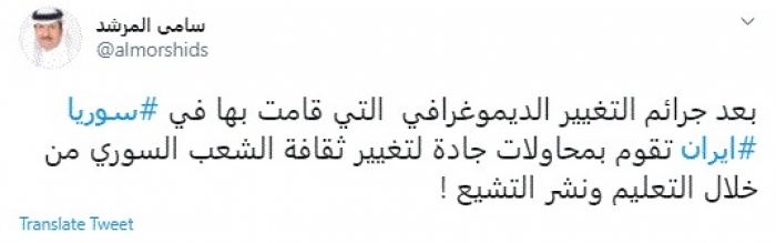 وقال في تغريدة عبر "تويتر" رصدها "المشهد العربي": "بعد جرائم التغيير الديموغرافي التي قامت بها في سوريا إيران تقوم بمحاولات جادة لتغيير ثقافة الشعب السوري من خلال التعليم ونشر التشيع".
