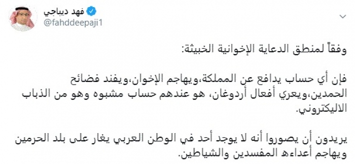 وقال في تغريدة عبر "تويتر" رصدها "المشهد العربي": "وفقاً لمنطق الدعاية الإخوانية الخبيثة: فإن أي حساب يدافع عن المملكة،ويهاجم الإخوان،ويفند فضائح الحمدين، ويعري أفعال أردوغان، هو عندهم حساب مشبوه وهو من الذباب الإليكتروني".