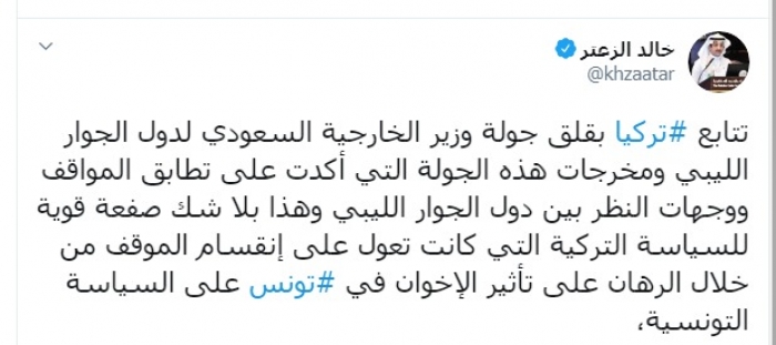 وكتب عبر تغريدة له على "تويتر" رصدها " المشهد العربي":"تتابع تركيا بقلق جولة وزير الخارجية السعودي لدول الجوار الليبي ومخرجات هذه الجولة التي أكدت على تطابق المواقف ووجهات النظر بين دول الجوار الليبي، وهذا بلا شك صفعة قوية للسياسة التركية التي كانت تعول على انقسام الموقف من خلال الرهان على تأثير الإخوان في تونس على السياسة التونسية".