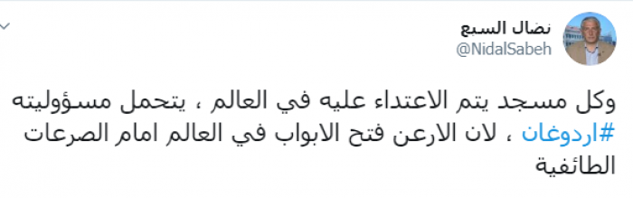 وكتب عبر تغريدة له على "تويتر" رصدها " المشهد العربي" :"وكل مسجد يتم الاعتداء عليه في العالم ، يتحمل مسؤوليته أردوغان ، لأن الأرعن فتح الأبواب في العالم أمام الصرعات الطائفية".