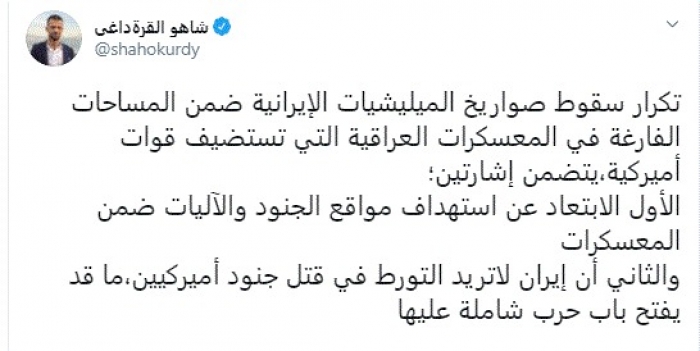 وقال في تغريدة عبر "تويتر" رصدها "المشهد العربي": تكرار سقوط صواريخ الميليشيات الإيرانية ضمن المساحات الفارغة في المعسكرات العراقية التي تستضيف قوات أميركية،يتضمن إشارتين".
