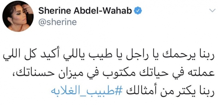 وكتبت شيرين تغريدة، عبر حسابها الرسمي بموقع "تويتر": "ربنا يرحمك يا راجل يا طيب ياللي أكيد كل اللي عملته في حياتك مكتوب في ميزان حسناتك، ربنا يكتر من أمثالك".