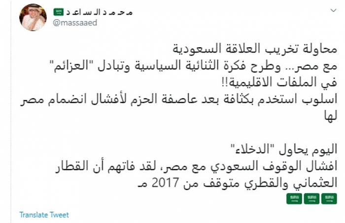 وقال في تغريدة عبر "تويتر" رصدها "المشهد العربي": "محاولة تخريب العلاقة السعودية مع مصر وطرح فكرة الثنائية السياسية وتبادل العزائم في الملفات الإقليمية أسلوب استخدم بكثافة بعد عاصفة الحزم لإفشال انضمام مصر لها".