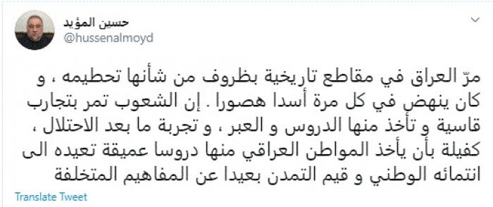 وكتب في تغريدة عبر "تويتر" رصدها "المشهد العربي": "مرّ العراق في مقاطع تاريخية بظروف من شأنها تحطيمه ، و كان ينهض في كل مرة أسدا هصورا".
