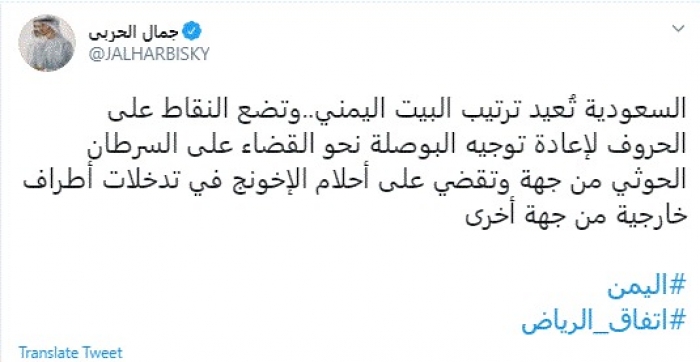 وكتب في تغريدة عبر "تويتر" رصدها "المشهد العربي": "السعودية تُعيد ترتيب البيت اليمني.. وتضع النقاط على الحروف لإعادة توجيه البوصلة نحو القضاء على السرطان الحوثي من جهة".