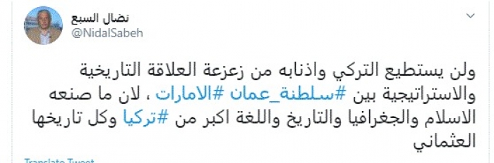 وقال في تغريدة عبر "تويتر" رصدها "المشهد العربي": "لن يستطيع التركي وأذنابه من زعزعة العلاقة التاريخية والاستراتيجية بين سلطنة عمان والإمارات".