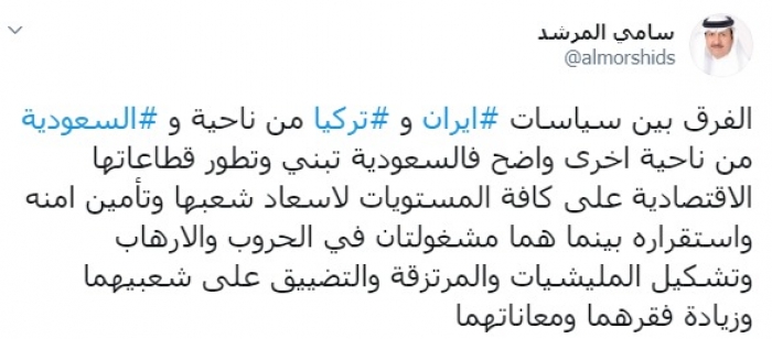وكتب عبر تغريدة له على "تويتر" رصدها " المشهد العربي": "الفرق بين سياسات إيران و تركيا من ناحية، والسعودية من ناحية أخرى واضح، فالسعودية تبني وتطور قطاعاتها الاقتصادية على كافة المستويات لإسعاد شعبها وتأمين أمنه واستقراره، بينما هما مشغولتان في الحروب والإرهاب وتشكيل المليشيات والمرتزقة والتضييق على شعبيهما وزيادة فقرهما ومعاناتهما".