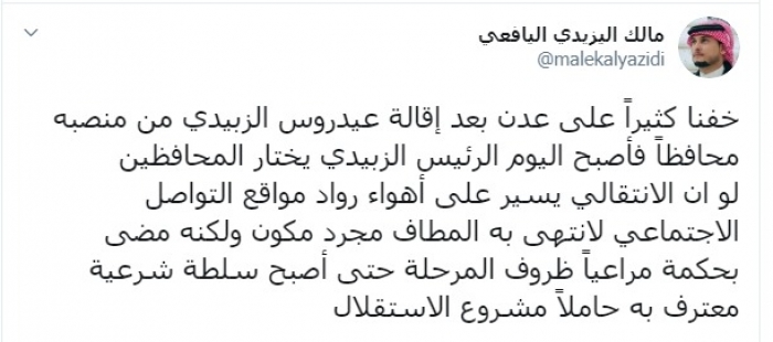 وكتب عبر تغريدة له على "تويتر" رصدها "المشهد العربي": "خفنا كثيرا على عدن بعد إقالة عيدروس الزُبيدي من منصبه محافظا، فأصبح اليوم الرئيس الزُبيدي يختار المحافظين، لو أن الانتقالي يسير على أهواء رواد مواقع التواصل الاجتماعي لانتهى به المطاف مجرد مكون ولكنه مضى بحكمة مراعيا ظروف المرحلة حتى أصبح سلطة شرعية معترف به حاملا مشروع الاستقلال.