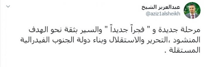 وكتب عبر تغريدة له على "تويتر" رصدها "المشهد العربي": "مرحلة جديدة" و"فجر جديد" والسير بثقة نحو الهدف المنشود، التحرير والاستقلال وبناء دولة الجنوب الفيدرالية المستقلة".