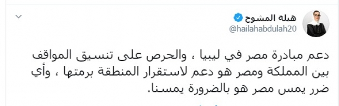 وكتبت عبر تغريدة لها على "تويتر" رصدها " المشهد العربي": "دعم مبادرة مصر في ليبيا ، والحرص على تنسيق المواقف بين المملكة ومصر، هو دعم لاستقرار المنطقة برمتها، وأي ضرر يمس مصر هو بالضرورة يمسنا".