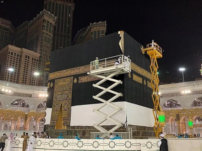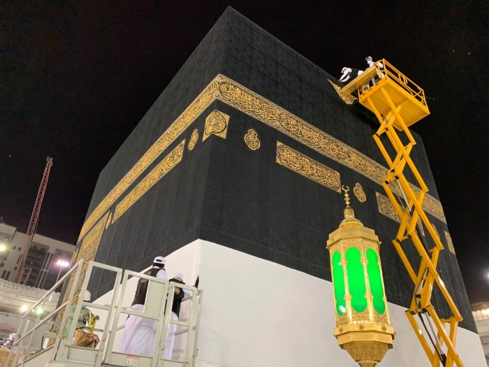 وقال مسؤولون، إن الفريق المحدد من الإدارة العامة لمجمع الملك عبدالعزيز لكسوة الكعبة المشرفة، قاموا بتفكيك الكسوة القديمة وتركيب الجديدة، ثم تثبيتها في أركان الكعبة وسطحها.