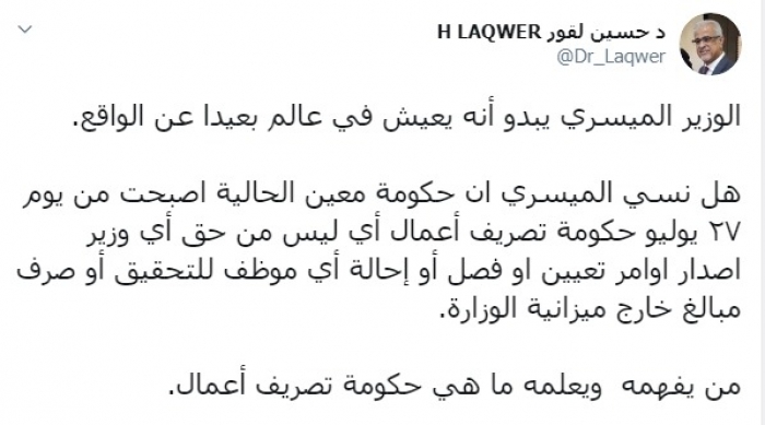 وكتب عبر تغريدة له على "تويتر" رصدها "المشهد العربي": "الوزير الميسري يبدو أنه يعيش في عالم بعيدا عن الواقع، هل نسي الميسري أن حكومة معين الحالية أصبحت من يوم ٢٧ يوليو حكومة تصريف أعمال أي ليس من حق أي وزير إصدار أوامر تعيين أو فصل أو إحالة أي موظف للتحقيق أو صرف مبالغ خارج ميزانية الوزارة، من يفهمه ويعلمه ما هي حكومة تصريف أعمال".