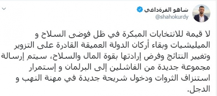 أكد الكاتب الصحفي العراقي شاهو القرة داغي، اليوم الأربعاء، أنه لا قيمة للانتخابات البرلمانية المبكرة في ظل فوضى السلاح والمليشيات.