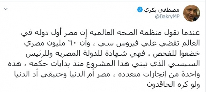 وكتب عبر تغريدة له على "تويتر" رصدها " المشهد العربي":"عندما تقول منظمة الصحة العالمية إن مصر أول دولة في العالم تقضي على فيروس سي ، وأن ٦٠ مليون مصري خضعوا للفحص، فهي شهادة للدولة المصرية وللرئيس السيسي الذي تبنى هذا المشروع منذ بدايات حكمه، هذه واحدة من إنجازات متعددة، مصر أم الدنيا وحتبقى أد الدنيا ولو كره الحاقدون".