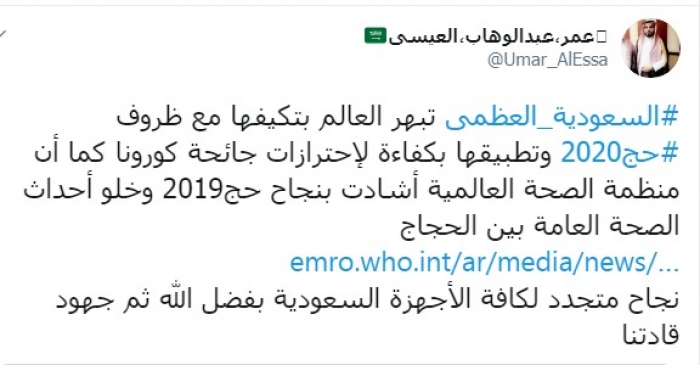 وكتب عبر تغريدة له على "تويتر" رصدها " المشهد العربي": "السعودية العظمى تبهر العالم بتكيفها مع ظروف حج2020 وتطبيقها بكفاءة لاحترازات جائحة كورونا كما أن منظمة الصحة العالمية أشادت بنجاح حج2019 وخلو أحداث الصحة العامة بين الحجاج، نجاح متجدد لكافة الأجهزة السعودية بفضل الله ثم جهود قادتنا".