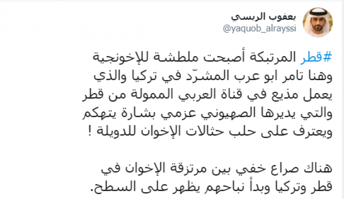 وكتب عبر تغريدة له على "تويتر" رصدها " المشهد العربي": "قطر المرتبكة أصبحت ملطشة للإخونجية، وهنا تامر أبو عرب المشرّد في تركيا والذي يعمل مذيع في قناة العربي الممولة من قطر، والتي يديرها الصهيوني عزمي بشارة يتهكم ويعترف على حلب حثالات الإخوان للدويلة، هناك صراع خفي بين مرتزقة الإخوان في قطر وتركيا وبدأ نباحهم يظهر على السطح".