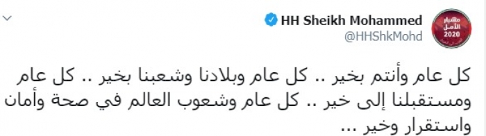 وكتب عبر تغريدة له على "تويتر" رصدها " المشهد العربي": "كل عام وأنتم بخير.. كل عام وبلادنا وشعبنا بخير.. كل عام ومستقبلنا إلى خير.. كل عام وشعوب العالم في صحة وأمان واستقرار وخير".