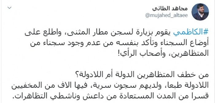 وكتب عبر تغريدة له على "تويتر" رصدها" المشهد العربي" :"الكاظمي يقوم بزيارة لسجن مطار المثنى، واطلع على أوضاع السجناء وتأكد بنفسه من عدم وجود سجناء من المتظاهرين، وأصحاب الرأي، من خطف المتظاهرين الدولة أم اللادولة، اللادولة طبعا، ولديهم سجون سرية، فيها الآف من المخفيين قسرا من المدن المستعادة من داعش وناشطي التظاهرات".