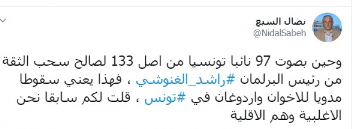 وكتب عبر تغريدة له على "تويتر" رصدها " المشهد العربي": "وحين يصوت 97 نائبا تونسيا من أصل 133 لصالح سحب الثقة من رئيس البرلمان راشد الغنوشي، فهذا يعني سقوطا مدويا للإخوان وأردوغان في تونس، قلت لكم سابقا نحن الأغلبية وهم الأقلية".
