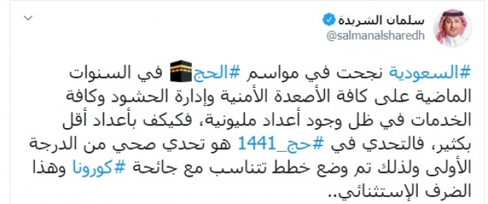 وكتب عبر تغريدة له على "تويتر" رصدها " المشهد العربي": "السعودية نجحت في مواسم الحج في السنوات الماضية على كافة الأصعدة الأمنية وإدارة الحشود وكافة الخدمات في ظل وجود أعداد مليونية، فكيف بأعداد أقل بكثير، فالتحدي في حج1441 هو تحدي صحي من الدرجة الأولى ولذلك تم وضع خطط تتناسب مع جائحة كورونا وهذا الظرف الاستثنائي".