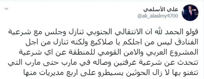 وكتب عبر تغريدة له على "تويتر" رصدها "المشهد العربي": "قولوا الحمد لله أن الانتقالي الجنوبي تنازل وجلس مع شرعية الفنادق ليس من أجلكم يا ...ولكنه تنازل من أجل المشروع العربي والأمن القومي للمنطقة عن أي شرعية تتحدث عن شرعية غرفتين وصالة في مأرب حتى مأرب التي تتغنوا بها لا زال الحوثيون يسيطرون على أربع مديريات منها".