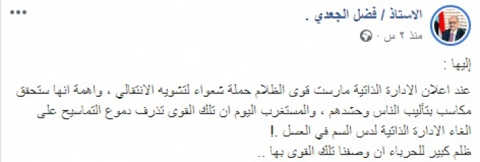 وكتب عبر تغريدة له على "تويتر" رصدها "المشهد العربي": "عند إعلان الادارة الذاتية مارست قوى الظلام حملة شعواء لتشويه الانتقالي، واهمة أنها ستحقق مكاسب بتأليب الناس وحشدهم، والمستغرب اليوم أن تلك القوى تذرف دموع التماسيح على إلغاء الإدارة الذاتية لدس السم في العسل، ظلم كبير للحرباء إن وصفنا تلك القوى بها".