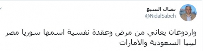وكتب عبر تغريدة له على "تويتر" رصدها " المشهد العربي": "وأردوغان يعاني من مرض وعقدة نفسية اسمها سوريا مصر ليبيا السعودية والإمارات".