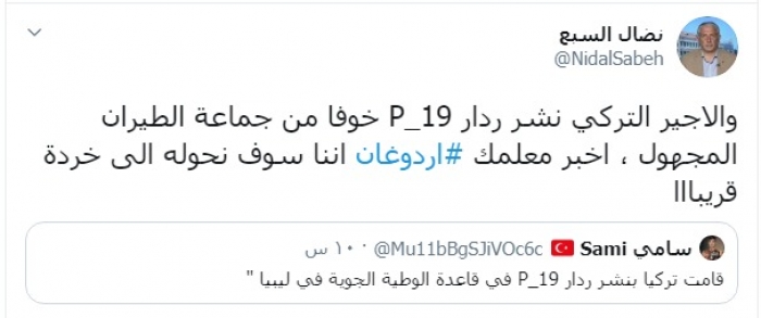 توعد المحلل السياسي اللبناني نضال السبع، اليوم الجمعة، رئيس النظام التركي رجب طيب أردوغان بهزيمة كبرى في ليبيا. وكتب عبر تغريدة له على "تويتر" رصدها " المشهد العربي": "والأجير التركي نشر ردار P_19 خوفا من جماعة الطيران المجهول ، أخبر معلمك أردوغان إننا سوف نحوله إلى خردة قريبا".