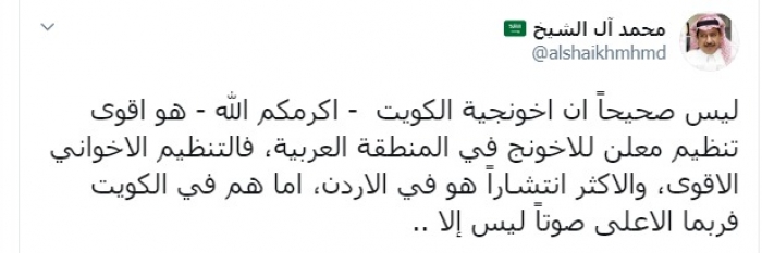 وكتب عبر تغريدة له على "تويتر" رصدها " المشهد العربي": "ليس صحيحاً إن إخونجية الكويت - أكرمكم الله - هو أقوى تنظيم معلن للإخونج في المنطقة العربية، فالتنظيم الإخواني الأقوى، والأكثر انتشاراً هو في الأردن، أما هم في الكويت فربما الأعلى صوتاً ليس إلا">