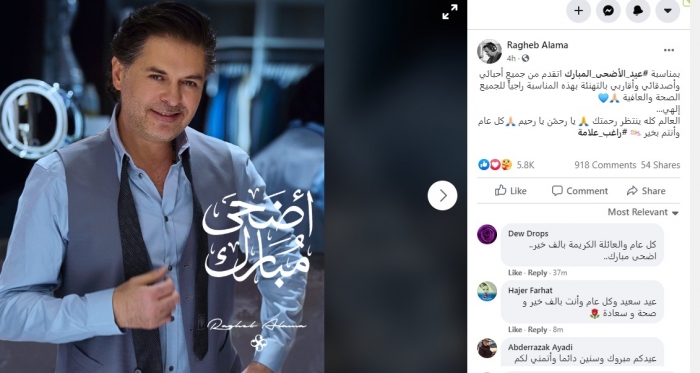 حرص الفنان اللبناني راغب علامة، على تهنئة جمهوره والأمة العربية بعيد الأضحى المبارك، عبر صفحته الرسمية على موقع "فيسبوك".