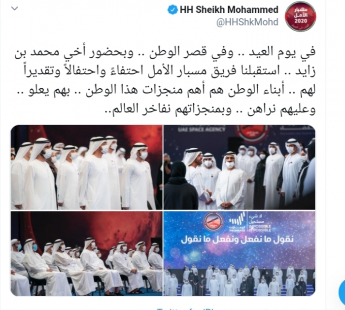 وكتب بن راشد عبر تغريدة له على "تويتر" رصدها" المشهد العربي" :"في يوم العيد وفي قصر الوطن، وبحضور أخي محمد بن زايد، استقبلنا فريق مسبار الأمل احتفاءً واحتفالاً وتقديراً لهم، أبناء الوطن هم أهم منجزات هذا الوطن، بهم يعلو، وعليهم نراهن ، وبمنجزاتهم نفاخر العالم".