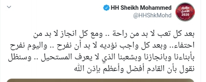 وأضاف :"بعد كل تعب لا بد من راحة، ومع كل انجاز لا بد من احتفاء، وبعد كل واجب نؤديه لا بد أن نفرح ،واليوم نفرح بأبناءنا وبإنجازنا وبشعبنا الذي لا يعرف المستحيل، وسنظل نقول بأن القادم أفضل وأعظم بإذن الله".
