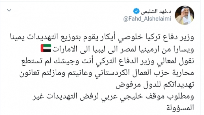 وكتب عبر تغريدة له على "تويتر" رصدها " المشهد العربي":"وزير دفاع تركيا خلوصي أيكار يقوم بتوزيع التهديدات يمينا ويسارا من أرمينيا لمصر إلى ليبيا إلى الإمارات، نقول لمعالي وزير الدفاع التركي أنت وجيشك لم تستطع محاربة حزب العمال الكردستاني وعانيتم ومازلتم تعانون،تهديداتكم للدول مرفوض ومطلوب موقف خليجي عربي لرفض التهديدات غير المسؤولة".