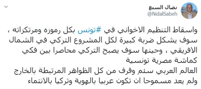 وكتب عبر تغريدة له على "تويتر" رصدها " المشهد العربي": :"وإسقاط التنظيم الإخواني في تونس بكل رموزه ومرتكزاته ، سوف يشكل ضربة كبيرة لكل المشروع التركي في الشمال الإفريقي ، وحينها سوف يصبح التركي محاصرا بين فكي كماشة مصرية تونسية، العالم العربي سئم وقرف من كل الظواهر المرتبطة بالخارج ولم يعد مسموحا أن تكون عربيا بالهوية وتركيا بالانتماء".