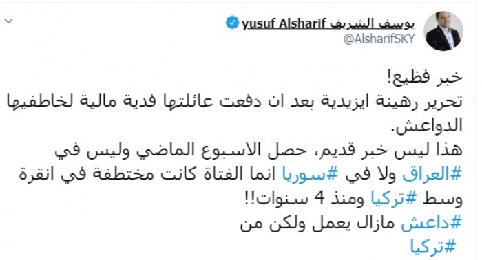وكتب عبر تغريدة له على "تويتر" رصدها " المشهد العربي": "خبر فظيع، تحرير رهينة إيزيدية بعد أن دفعت عائلتها فدية مالية لخاطفيها الدواعش، هذا ليس خبر قديم، حصل الأسبوع الماضي وليس في العراق ولا في سوريا، إنما الفتاة كانت مختطفة في أنقرة وسط تركيا ومنذ 4 سنوات، داعش مازال يعمل ولكن من تركيا".