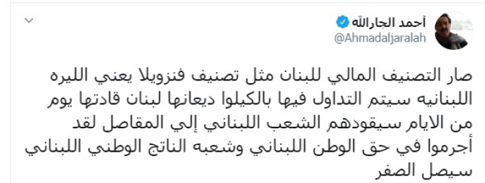 وكتب عبر تغريدة له على "تويتر" رصدها " المشهد العربي": "صار التصنيف المالي للبنان مثل تصنيف فنزويلا يعني الليرة اللبنانية سيتم التداول فيها بالكيلو، لبنان قادتها يوم من الأيام سيقودهم الشعب اللبناني إلي المقاصل لقد أجرموا في حق الوطن اللبناني وشعبه، الناتج الوطني اللبناني سيصل الصفر".