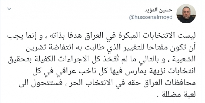 وكتب عبر تغريدة له على "تويتر" رصدها "المشهد العربي": "ليست الانتخابات المبكرة في العراق هدفا بذاته ، وإنما يجب أن تكون مفتاحا للتغيير الذي طالبت به انتفاضة تشرين الشعبية، و بالتالي ما لم تُتّخذ كل الإجراءات الكفيلة بتحقيق انتخابات نزيهة يمارس فيها كل ناخب عراقي في كل محافظات العراق حقه في الانتخاب الحر ، فستتحول إلى لعبة مضللة" .