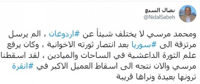 وكتب عبر تغريدة له على "تويتر" رصدها " المشهد العربي":"ومحمد مرسي لا يختلف شيئا عن أردوغان، ألم يرسل مرتزقة إلى سوريا بعد انتصار ثورته الإخوانية ، وكان يرفع علم الثورة الداعشية في الساحات والميادين ، لقد أسقطنا مرسي والآن نتجه إلى إسقاط العميل الأكبر في أنقرة، ترونها بعيدة ونراها قريبة".