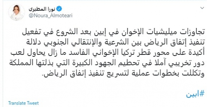 وكتبت في تغريدة عبر "تويتر" رصدها "المشهد العربي": "تجاوزات مليشيات الإخوان في أبين بعد الشروع في تفعيل تنفيذ اتفاق الرياض بين الشرعية والانتقالي الجنوبي دلالة أكيدة على محور قطر تركيا الإخواني الفاسد ما زال يحاول لعب دور تخريبي آملًا في تحطيم الجهود الكبيرة التي بذلتها المملكة وتكللت بخطوات عملية لتسريع تنفيذ اتفاق الرياض".