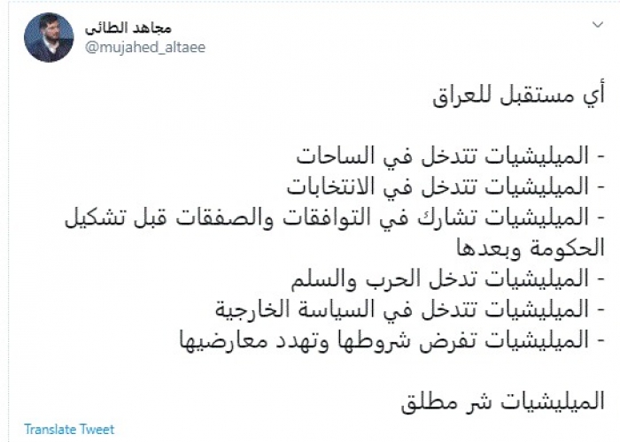 وقال في تغريدة عبر "تويتر" رصدها "المشهد العربي": "أي مستقبل للعراق.. المليشيات تتدخل في الساحات والانتخابات وتشارك في التوافقات والصفقات قبل تشكيل الحكومة وبعدها".
