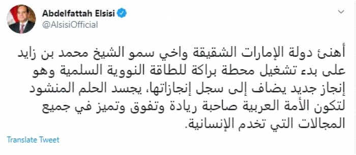 هنأ الرئيس المصري عبدالفتاح السيسي، اليوم، الإمارات العربية المتحدة على بدء تشغيل محطة براكة للطاقة النووية السلمية.