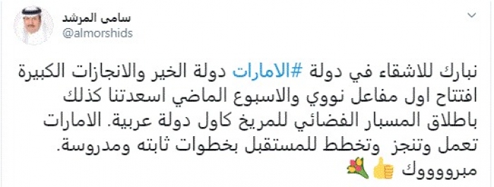 وقال في تغريدة عبر "تويتر" رصدها "المشهد العربي": "نبارك للأشقاء في دولة الإمارات دولة الخير والإنجازات الكبيرة افتتاح أول مفاعل نووي والأسبوع الماضي أسعدتنا كذلك بإطلاق المسبار الفضائي للمريخ كأول دولة عربية. الإمارات تعمل وتنجز وتخطط للمستقبل بخطوات ثابته ومدروسة. مبرووووك".