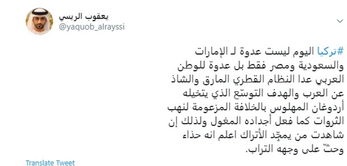 قال الكاتب الإماراتي يعقوب الريسي، اليوم، إن تركيا تعادي الوطن العربي وليست في عداوة مع الإمارات والسعودية ومصر فقط.